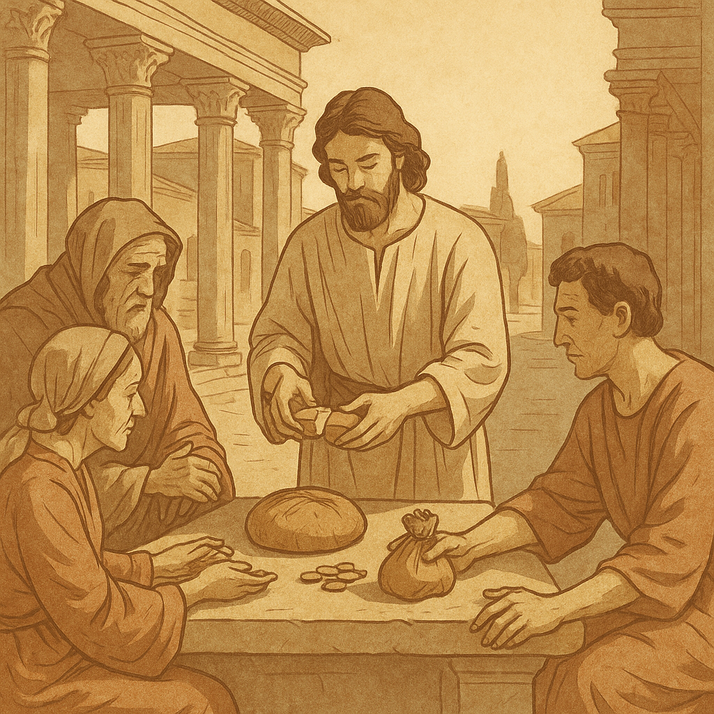 Gemeinschaftliches Teilen in Korinth (KI generiert)